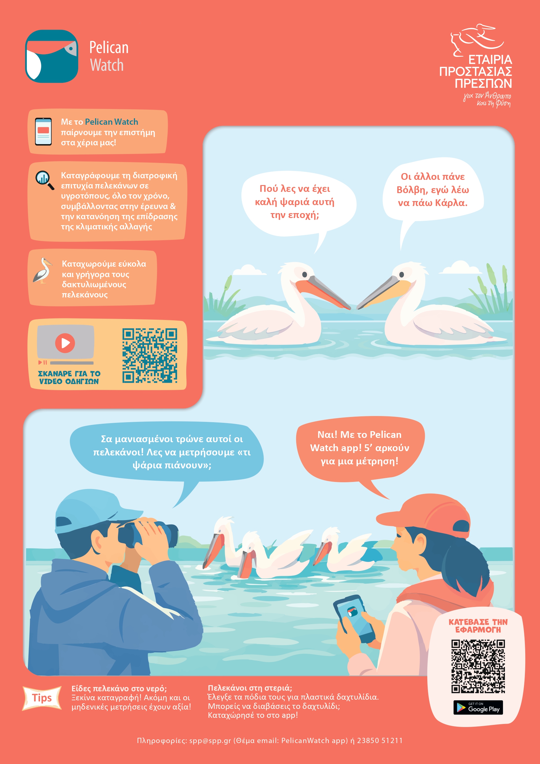 Μέσα από την εφαρμογή Pelican Watch, οι συμμετέχοντες μπορούν να καταγράφουν σημαντικά δεδομένα από τις παρατηρήσεις τους στο πεδίο, ενισχύοντας ουσιαστικά την επιστημονική γνώση για το είδος.