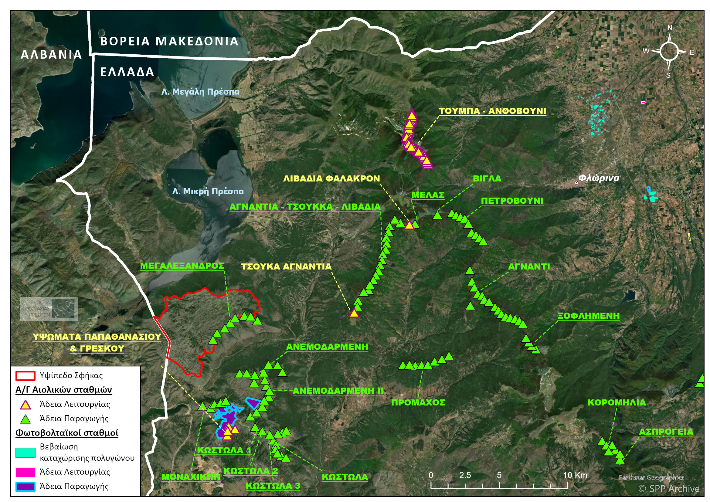Χάρτης 2: Η σημερινή εικόνα του σχεδιασμού έργων αιολικών και φωτοβολταϊκών σταθμών στην περιοχή μεταξύ Πρέσπας, Φλώρινας και Καστοριάς (τα διαφορετικά χρώματα δηλώνουν διαφορετικά στάδια της αδειοδότησης των έργων). Αθροίζονται συνολικά 155 ανεμογεννήτριες (με Άδεια Παραγωγής: 110, με Άδεια Εγκατάστασης: 5 και με Άδεια Λειτουργίας, δηλαδή ήδη κατασκευασμένες και σε λειτουργία: 40) (πηγή: Geoportal ΡΑΕ)